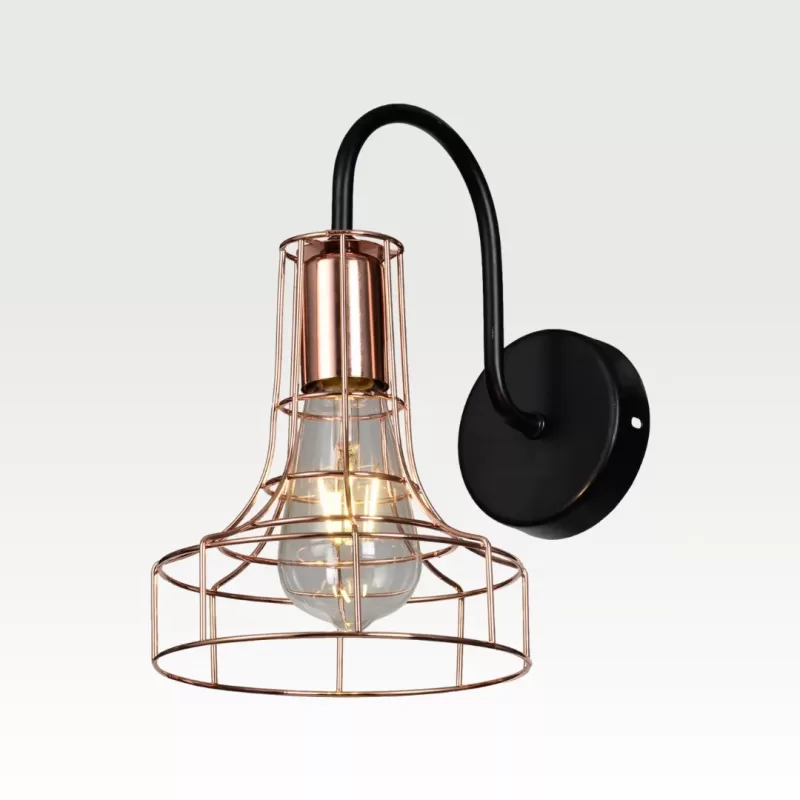Aplique de pared de acero, acabados en negro y oro rosa; soporte E27 para un foco