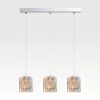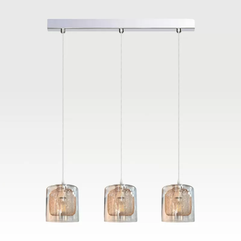 Lámpara colgante de acero y vidrio, acabado cromado con malla en color cobre; soporte E27 para tres focos